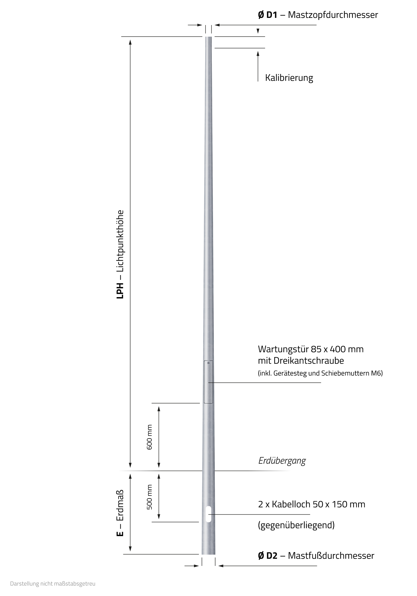 - Mastfußdurchmesser (D2): 150 mm bei 76 mm Zopf / 141 mm bei 60er Zopf