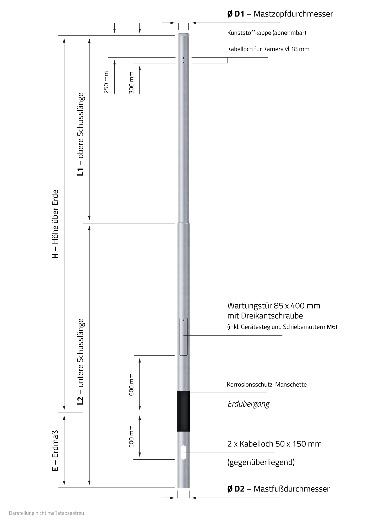 4m Kameramast, zylindrisch abgesetzt, Zopf 108 mm, Stahl verzinkt - Auslenkung max. 90 mm