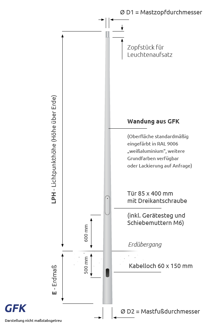 Ein robuster und sehr langlebiger Laternenmast für nahezu alle Einsatzgebiete. So präsentiert sich unser sehr hochwertiger 6m GFK Beleuchtungsmast aus glasfaserverstärktem Kunststoff. Er wird via Schleuderverfahren hergestellt und besticht besonders durch seine extrem hohe Lebensdauer, seine sehr hohe Beständigkeit gegen Korrosion aller Art und seine perfekt nahtlose, glatte GFK-Oberfläche. Diese ist bereits in RAL 9006 Weißaluminium eingefärbt und kann zusätzlich in einer anderen RAL-Farbe lackiert geliefert werden.