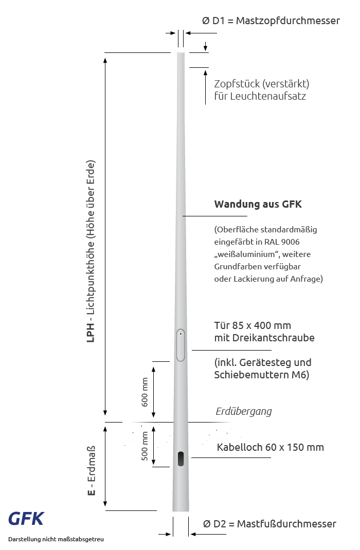 Dieser 6m GFK Laternenmast ist die innovative Lösung zur Installation von Mastleuchten aller Art. Sein glasfaserverstärkter Kunststoff gefertigt besticht besonders durch seine sehr hohe Langlebigkeit von über 45 Jahren. Seine Wandung wird aus vielen Schichten GFK hergestellt und ist besonders beständig gegen Korrosion durch Nässe, Chemikalien wie Streusalze oder Ähnliches und Hinterlassenschaften von Vierbeinern. Er besitzt einen Zopf von 76 mm (oberer Durchmesser) und eine schlanke, konische Bauform. Anders als bei Betonmasten oder Stahlmasten, bietet er eine höhere passive Sicherheit im Straßenverkehr und steht optisch Laternenmasten aus anderen Materialien in nichts nach. Unser 6m GFK Laternenmast wird schon während seiner Herstellung in RAL 9006 "Weißaluminium" eingefärbt, was ihn farblich passend zu nahezu allen handelsüblichen Mastleuchten macht.