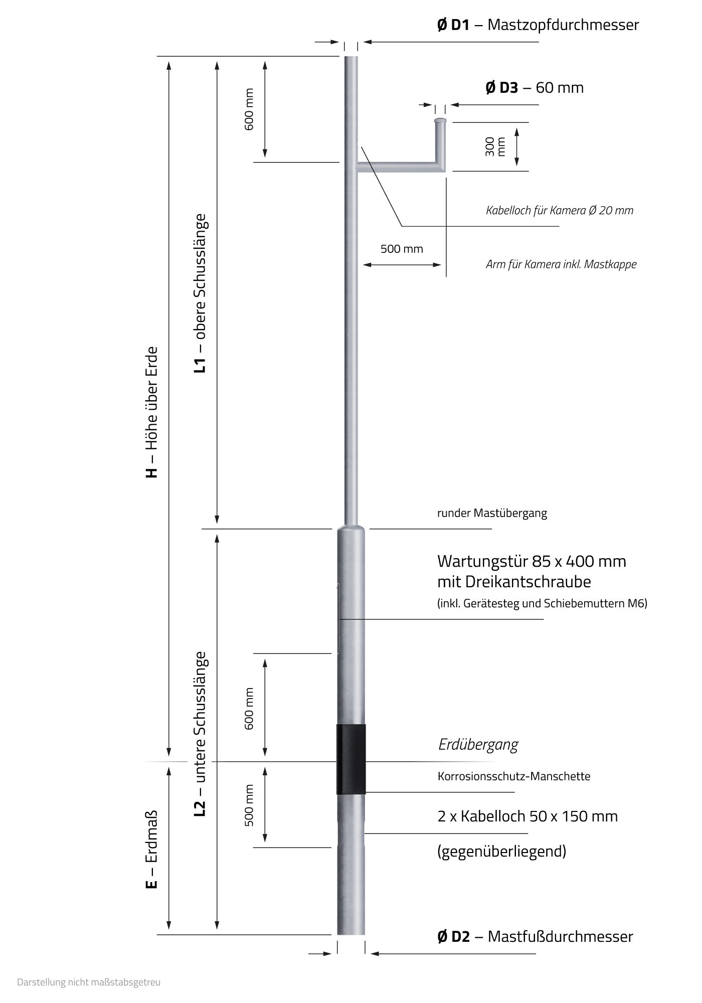 insgesamt für bis zu 1 bzw. 2 Leuchten + Kameras ausgelegt - Mastfußdurchmesser (D2): 159 mm